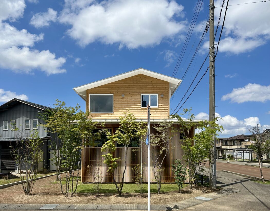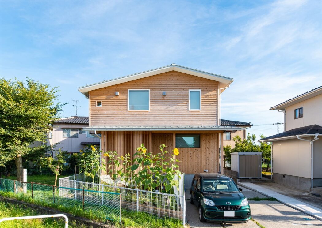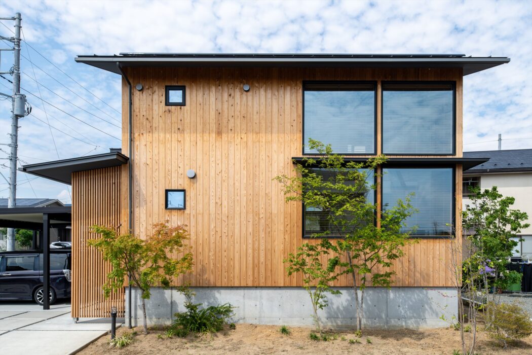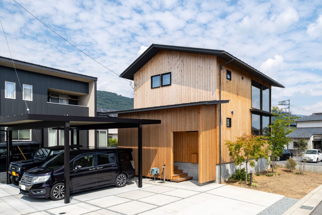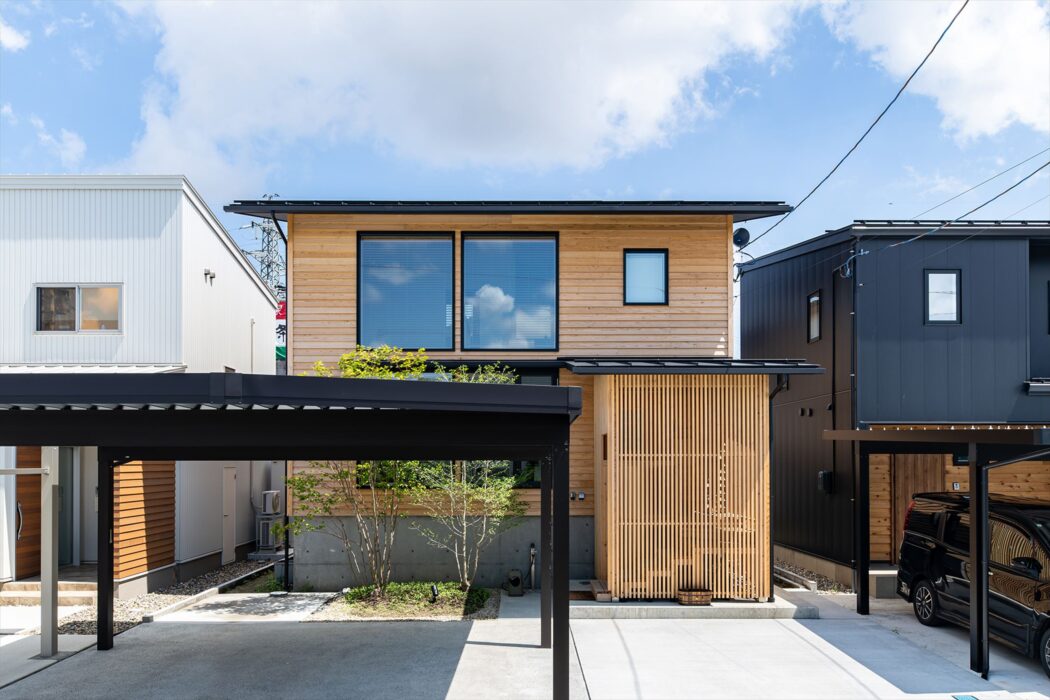 下屋、ウッドデッキポーチ、ルーバーウォールはエスネルの外観アイコンとなっている。
