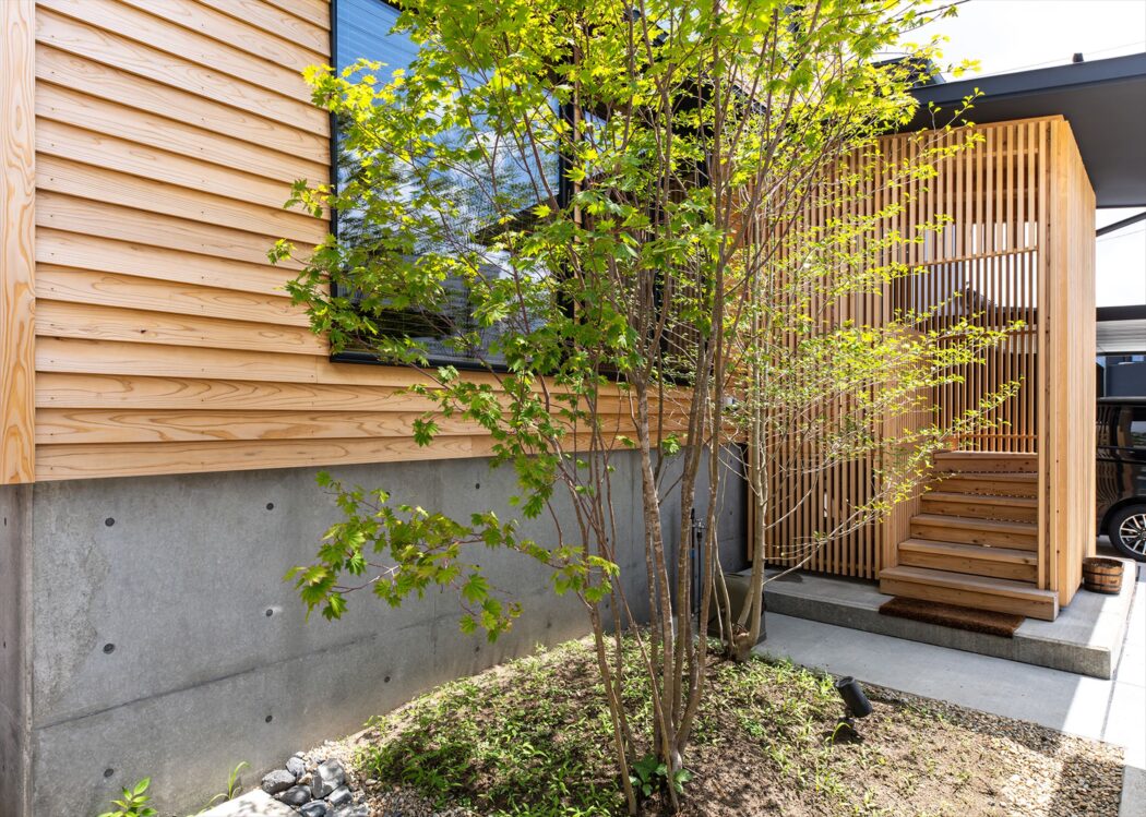 『ウッドデッキ玄関ポーチ』と『ルーバーウォール』により塀なしの利点を得つつ、内外の緩衝空間を叶えたい。
