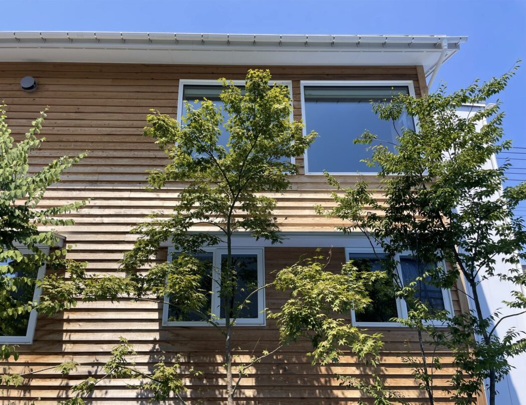 屋根や庇で窓に影がかかっている(日射遮蔽されている)様子が分かる。