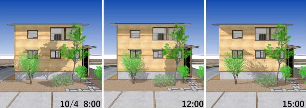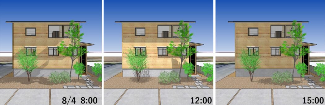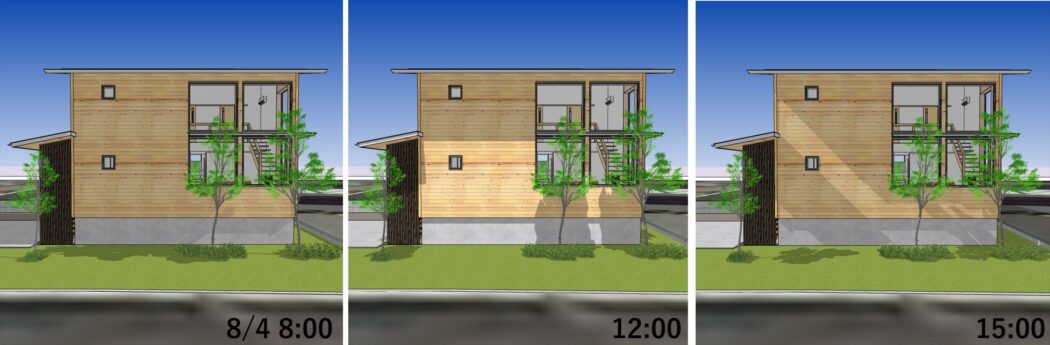 朝や夕方など局所的に日が入る時間もあるが屋根や庇で概ね日射遮蔽されることが分かる。