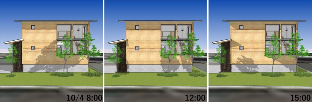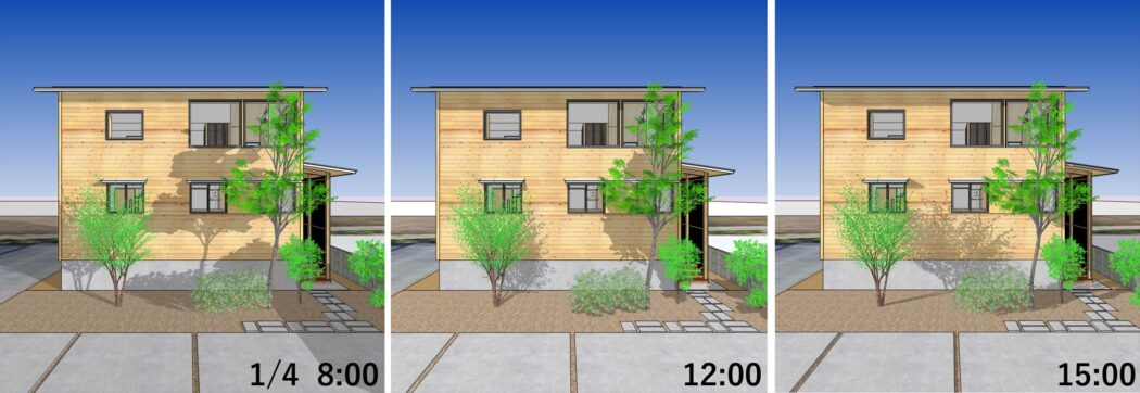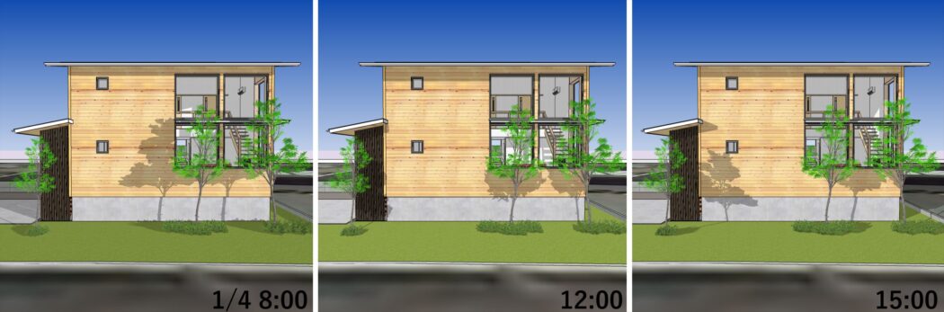 夏の遮蔽と冬の取得、日の当たり方の様子。