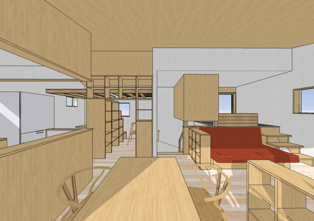 【高崎】3Dパース紹介『多彩な居場所のある2階リビングの家。』-木に包まれる暮らし、空を抜く窓- - 住宅設計エスネルデザイン