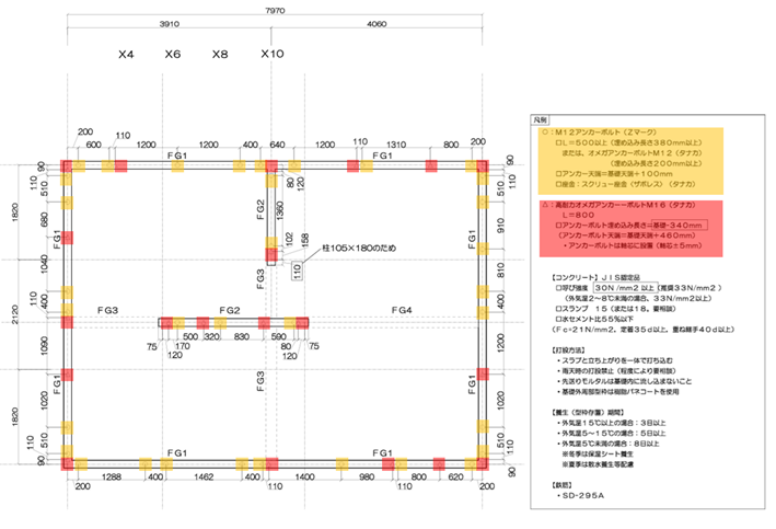 「耐震等級3(Z=1.0、積雪量1.5m)+余力」を考慮した構造計算を行い適切なアンカーボルトを選定している。