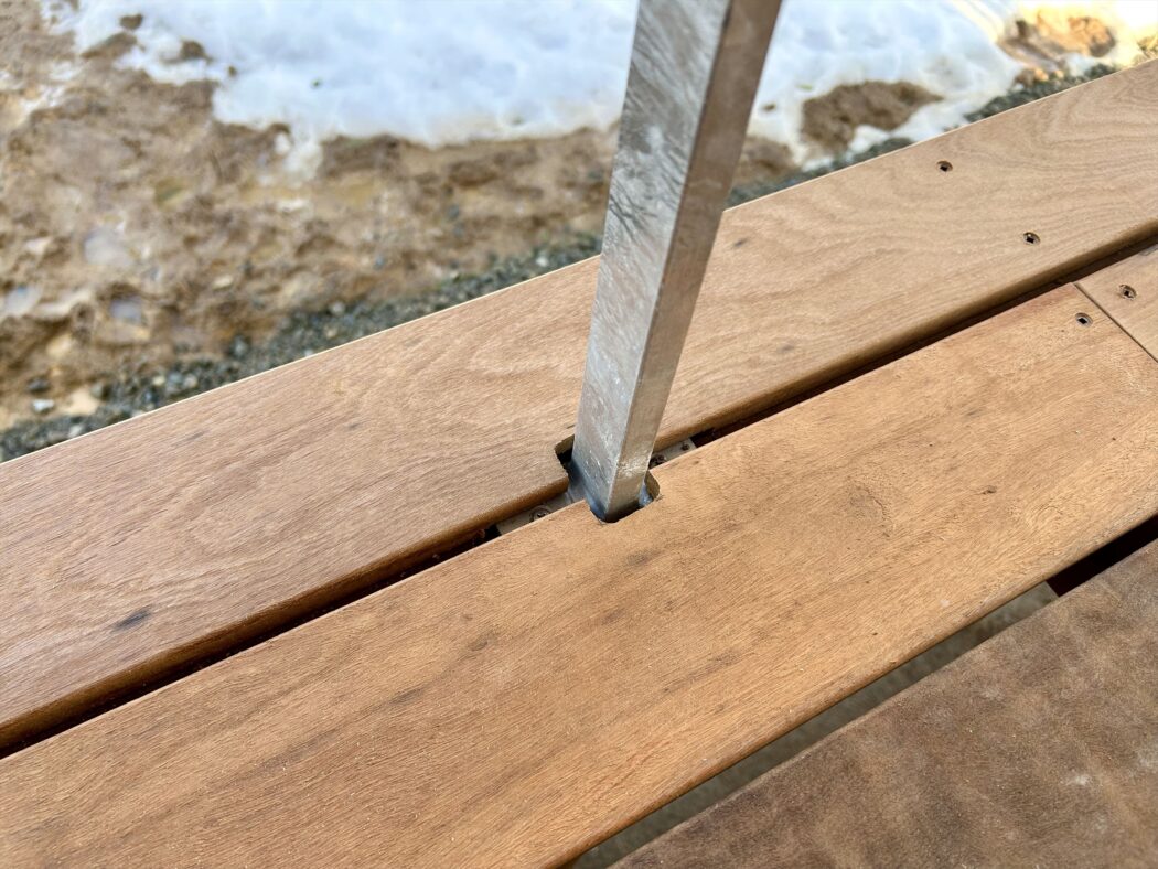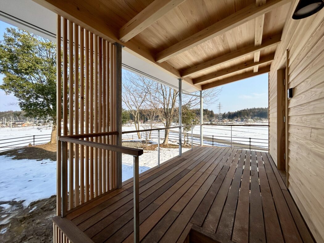 森を望む幅広ウッドデッキ玄関ポーチ。