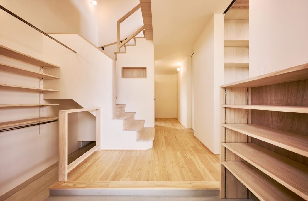 「玄関-2階への階段-床下階段」を併設させ『光の広がり』『視線の抜け』『広さ感』が得られるよう設計を行った。