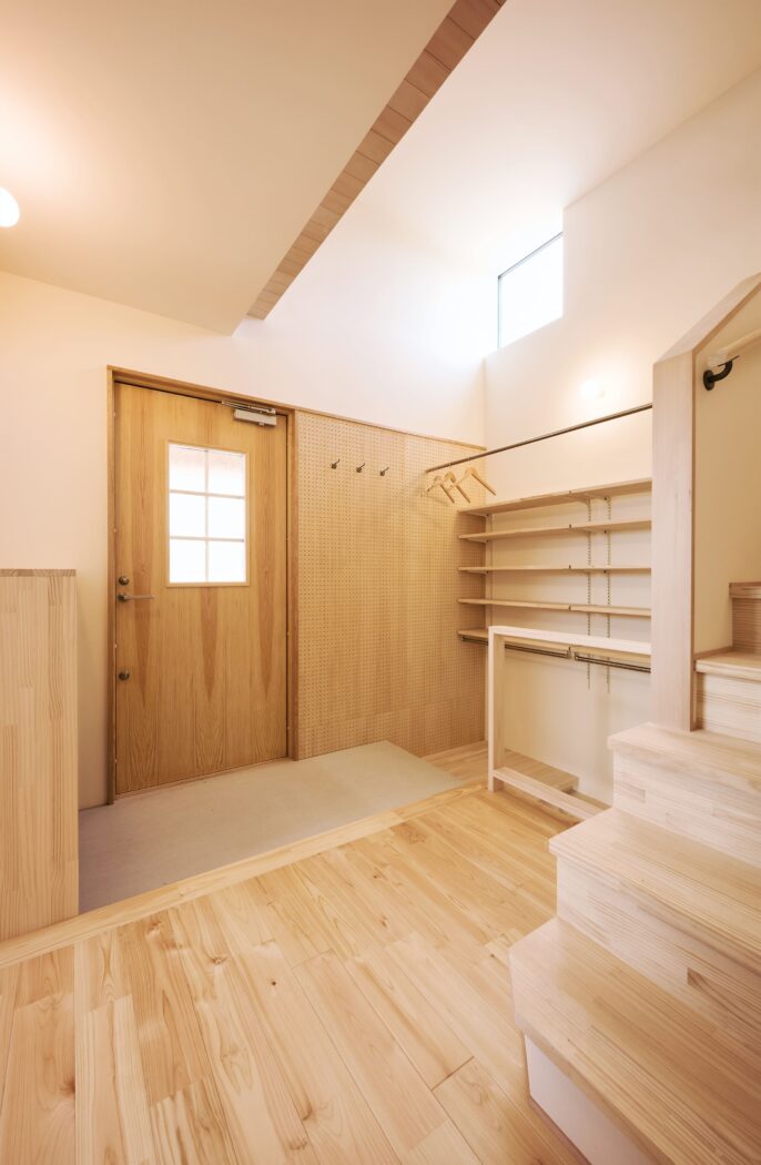 靴やコートのための玄関収納も十分に確保している。
