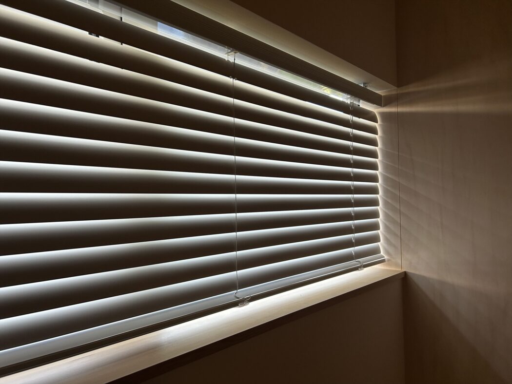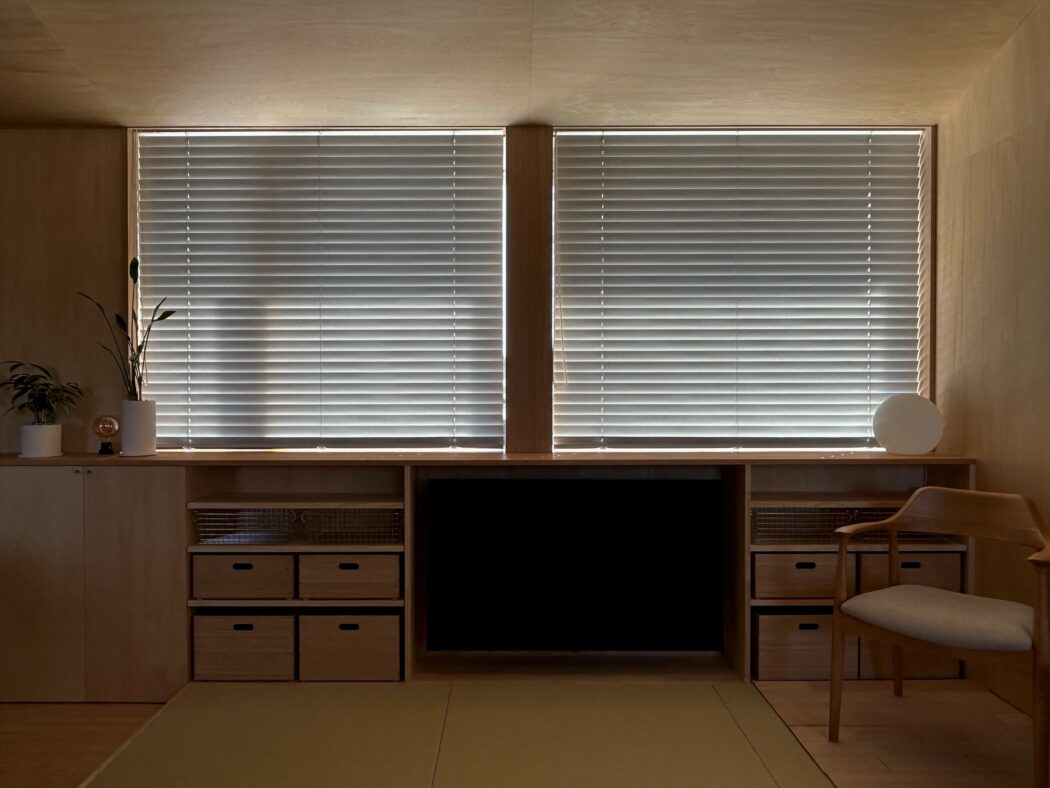 悩ましかったが「一台で済むこと」「羽水平時の風合いが好み」等を考慮しアルミブラインドを採用した。