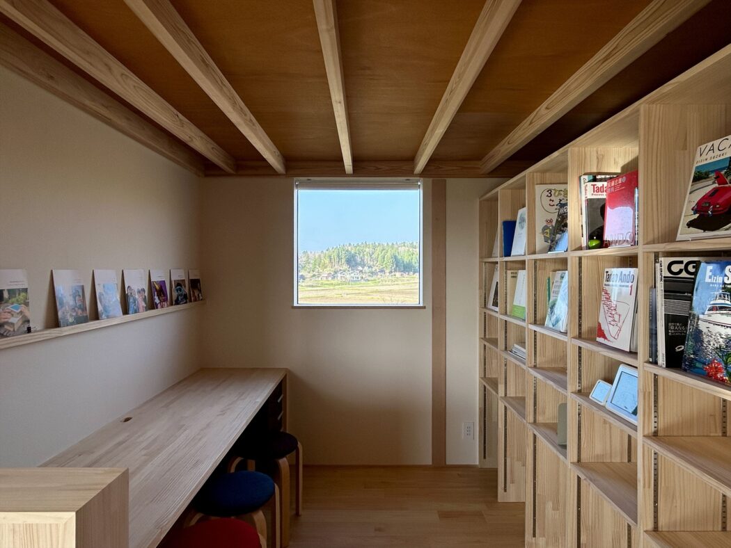 「羽幅5cm」「ホワイト」のアルミブラインドはシナ合板張りの内装によく馴染んでいる。