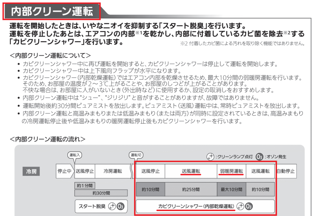 内部クリーン運転とはエアコン停止後に「送風や暖房を行いエアコン内部を乾かす」というもの。