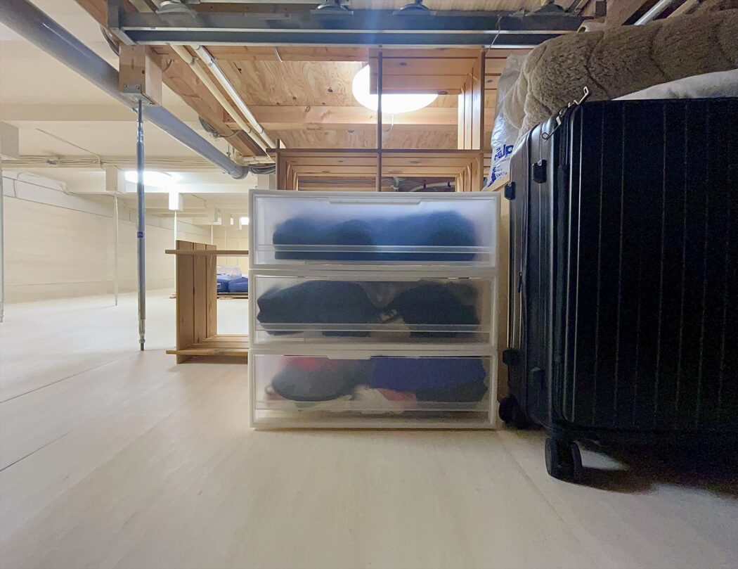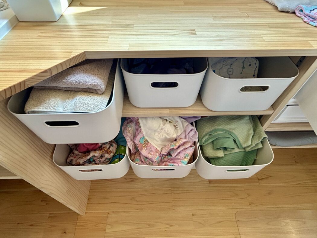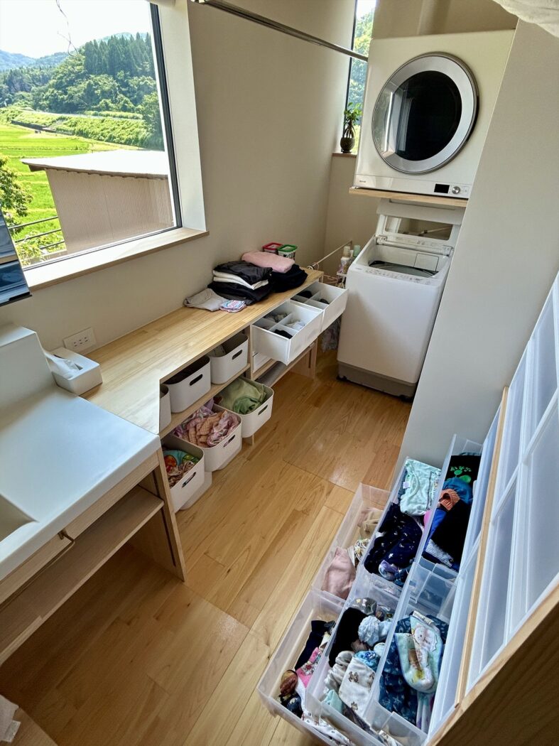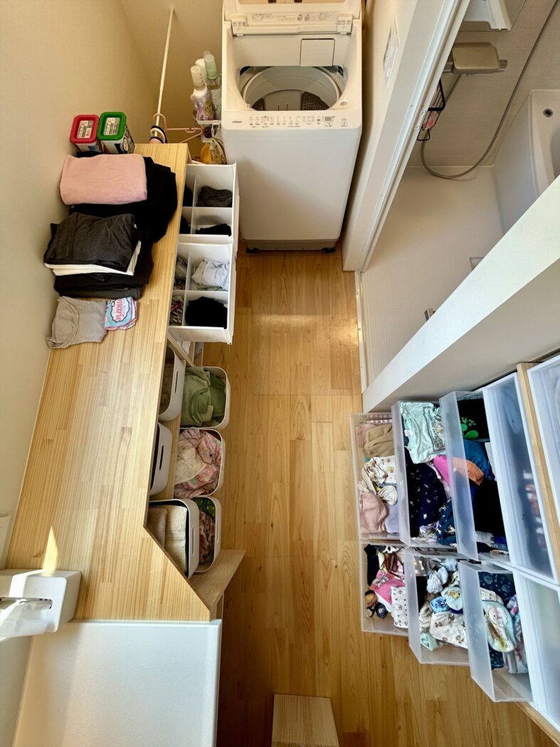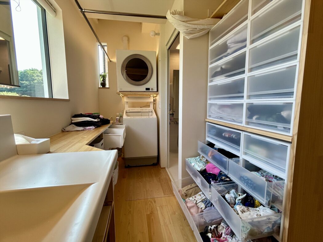 物干しスペース下部は収納とし部屋着-タオル類-下着等を収納。