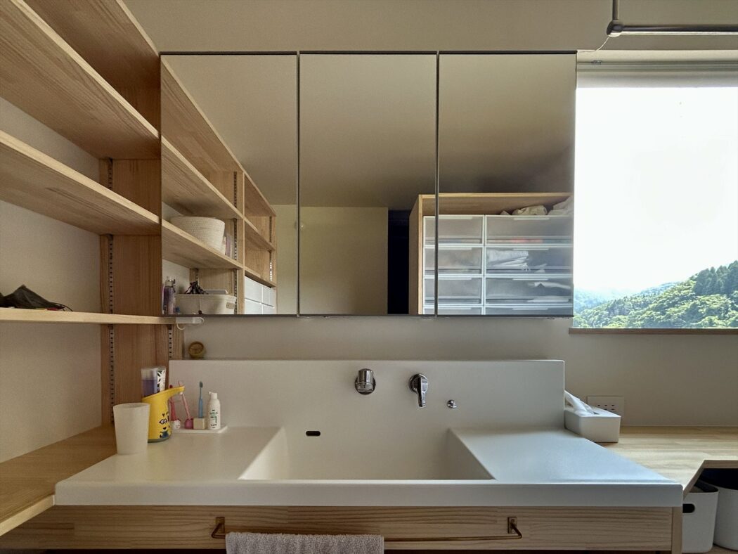 「植栽をゆっくり眺められるのは歯磨きの時」という庭師さんの言葉に感銘を受けこの窓を設計した。