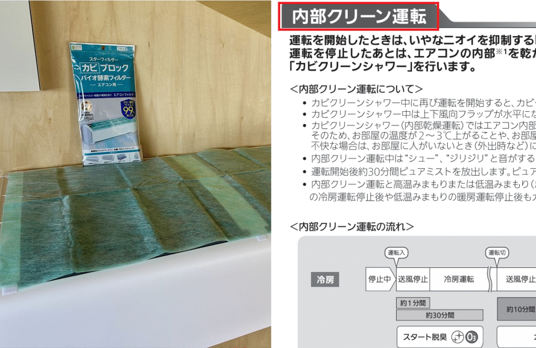 まず、夏前にカビ対策として『追加フィルター設置、内部クリーン運転』を実施していました。