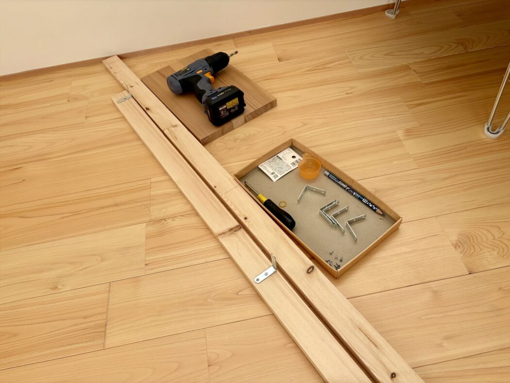 「本棚を造る」と言っても仰々しいものではなくただ「細い木材を壁に固定する」だけ。