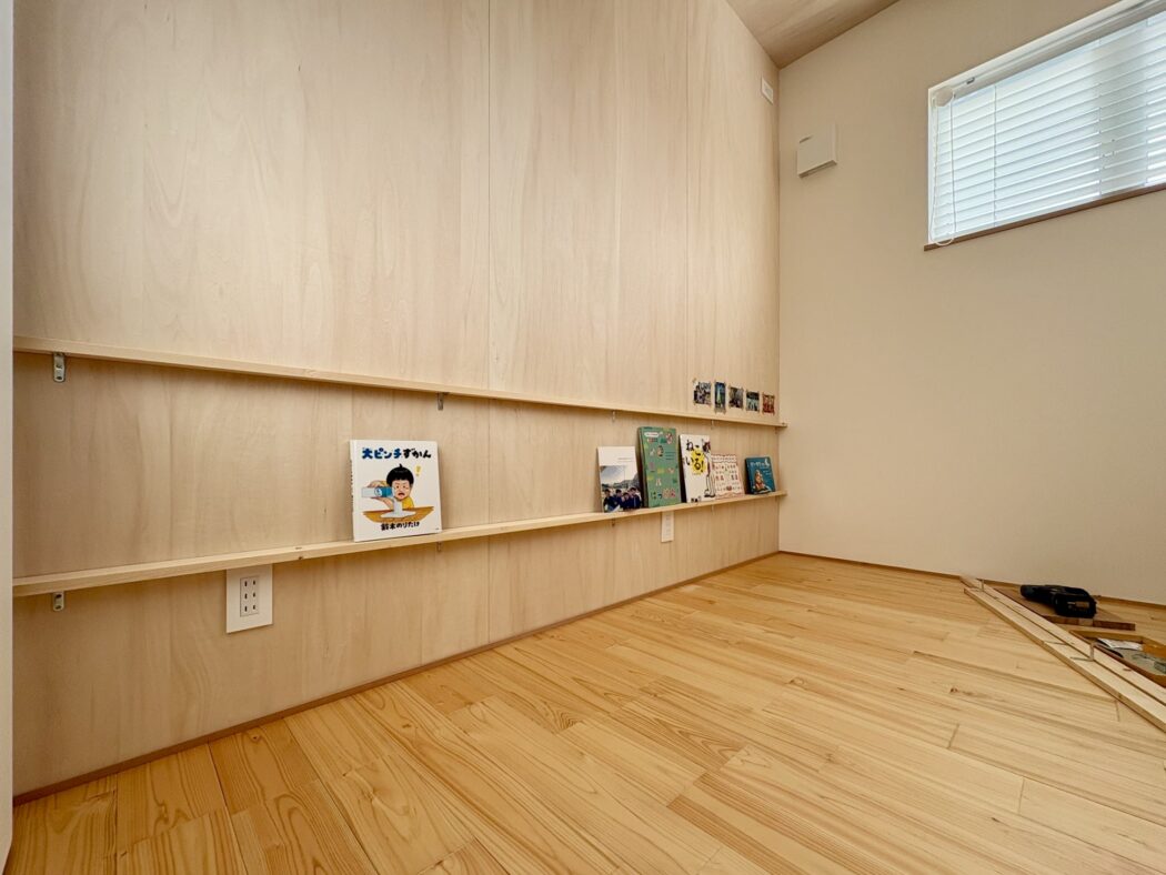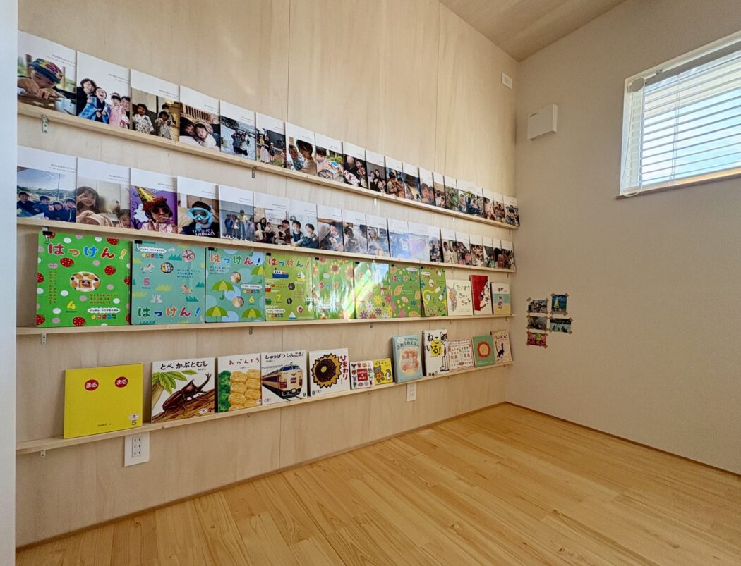 お気に入りの絵本や家族のアルバムが並べられた本棚。