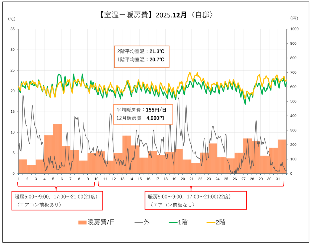 12/9までエアコン前板あり…1階室温 > 2階室温(暖房オン時)。