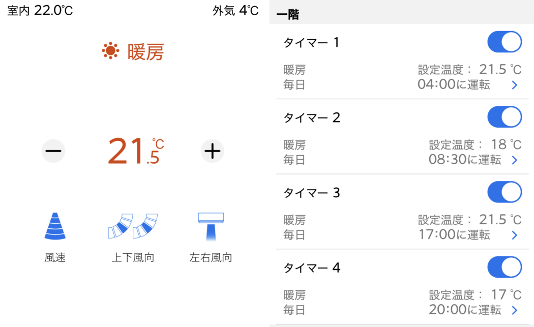 「時間-設定温度-風速-風向」など容易に調整できて便利♪