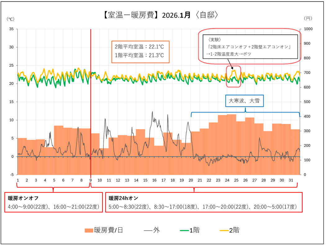 2階床エアコンをオフし2階壁エアコンで暖房を行ってみた(1/24)。