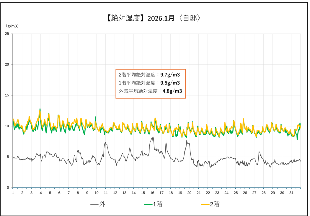 絶対湿度は1-2階とも9-10g/㎥程。