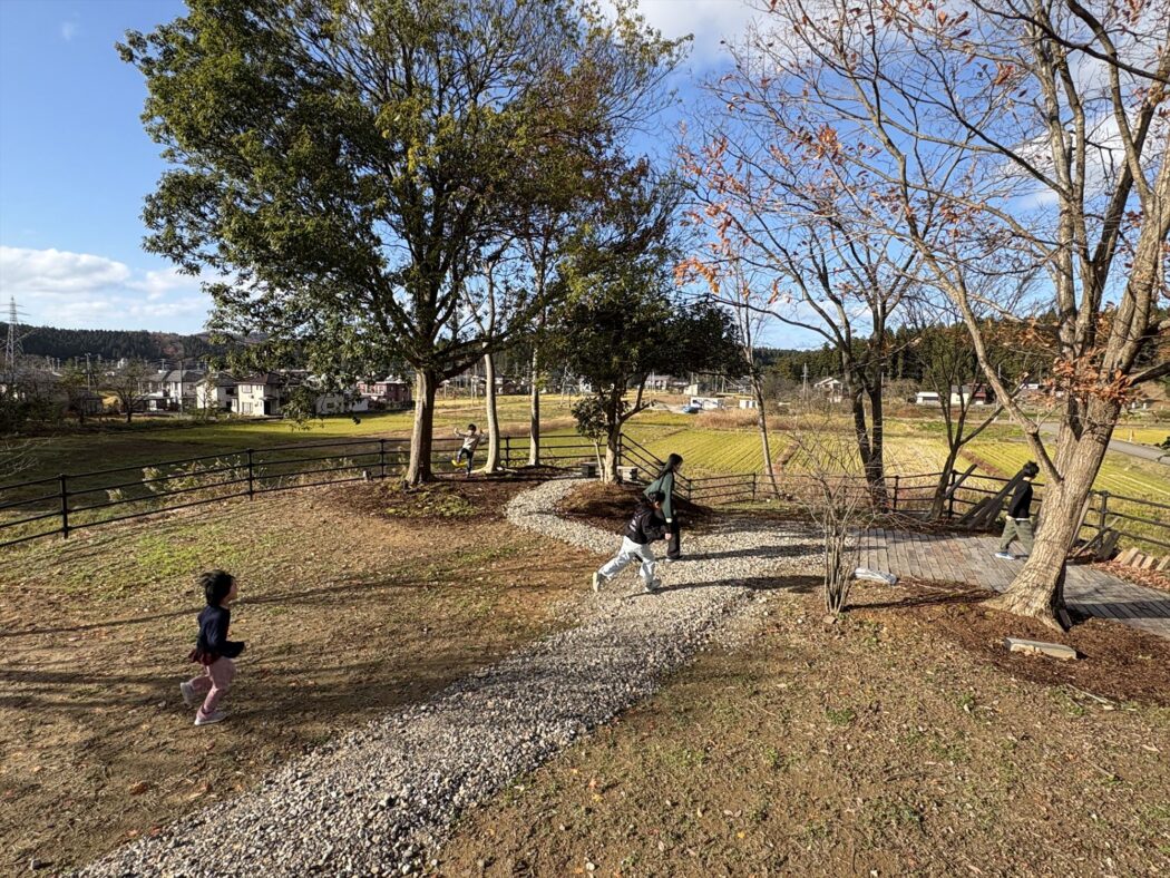 手を入れた庭で子供たちが遊ぶ。