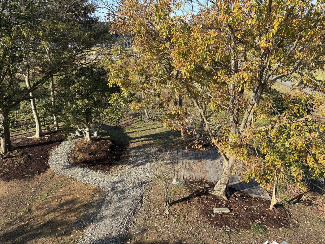 EGW小川さんに砕石敷きや木の根元のマルチングをして頂く。